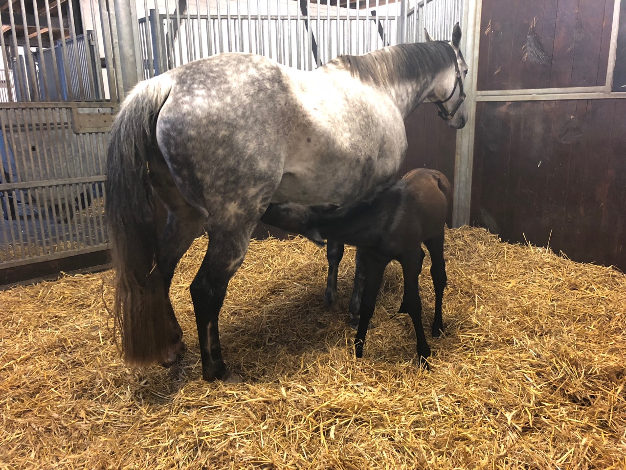 The next foal of the breeding season 2018 was born at 1:35 on the 31st of January at SCHLOSSGUT ITLINGEN. This time a filly by the 2000 Guineas winner MASTERCRAFTSMAN out of the Norsk Oaks winner ZEGNA. Withe her grey eyes and quite long ears the beautiful filly looks quite unusual. However being by a classic winner out of an classic winner, she carries some hopes for her breeders Graf und Grafin Stauffenberg. Especially as the first foal out of ZEGNA, a filly by NAYEF, named ZAHARA won her Maiden with 7 length very impressive at 2 at Jagersro and is aiming for the Scandinavian Classics in 2018. She is running in the colours of Mr Ascot, in whose colours ZEGNA won the Oaks. Both fillies have been sold by STAUFFENBERG BLOODSTOCK at the BBAG Yearling Sales. ZEGNA herself by Derbywinner SHIROCCO, is a sister to Swedish Derby- and multiple classic winner ZENATO and was bought back privately by her breeders after she had finished her racing career.