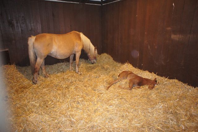 However the colt was adopted by a foster mare, and is seen relaxing with his new mom just less than 24 hours after his dam died.